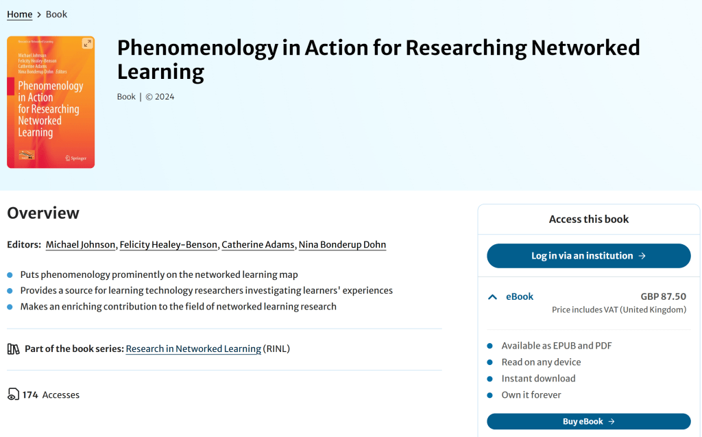 We’re excited to share that ahead of the hard copy release in a couple of weeks, the eBook option for our Springer, Phenomenology in Action for Researching Networked Learning is already gaining significant attention within the community. With 174 accesses in just a short period, we really do hope the work is striking a chord with readers.